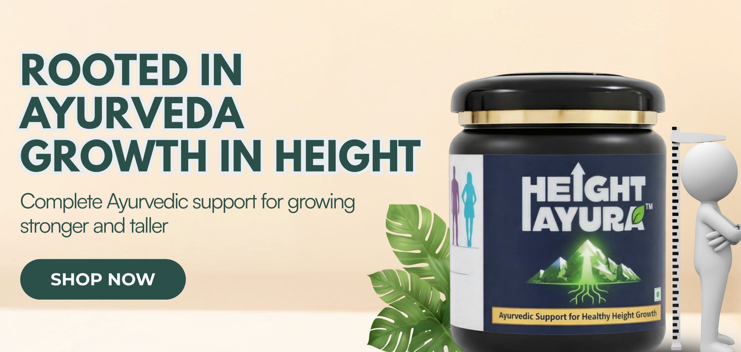 Height Ayura is an Ayurvedic wellness formulation designed to support bone strength, posture, digestion, and overall physical development using traditional herbal ingredients.